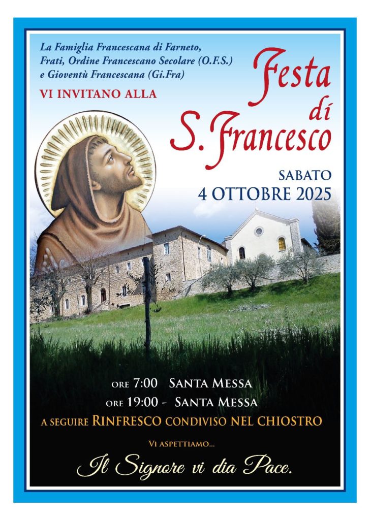 Festa di San Francesco – 4 ottobre 2025 23 Settembre 2025 by up20perugia La Famiglia Francescana di Farneto invita tutta la comunità a celebrare la Festa di San Francesco sabato 4 ottobre 2025, con Sante Messe alle ore 7:00 e 19:00. A seguire, momento di fraternità con rinfresco condiviso nel chiostro.